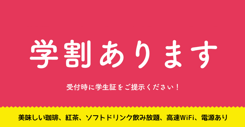 【学割あります!】フリードリンク付+高速Wifi・電源あり