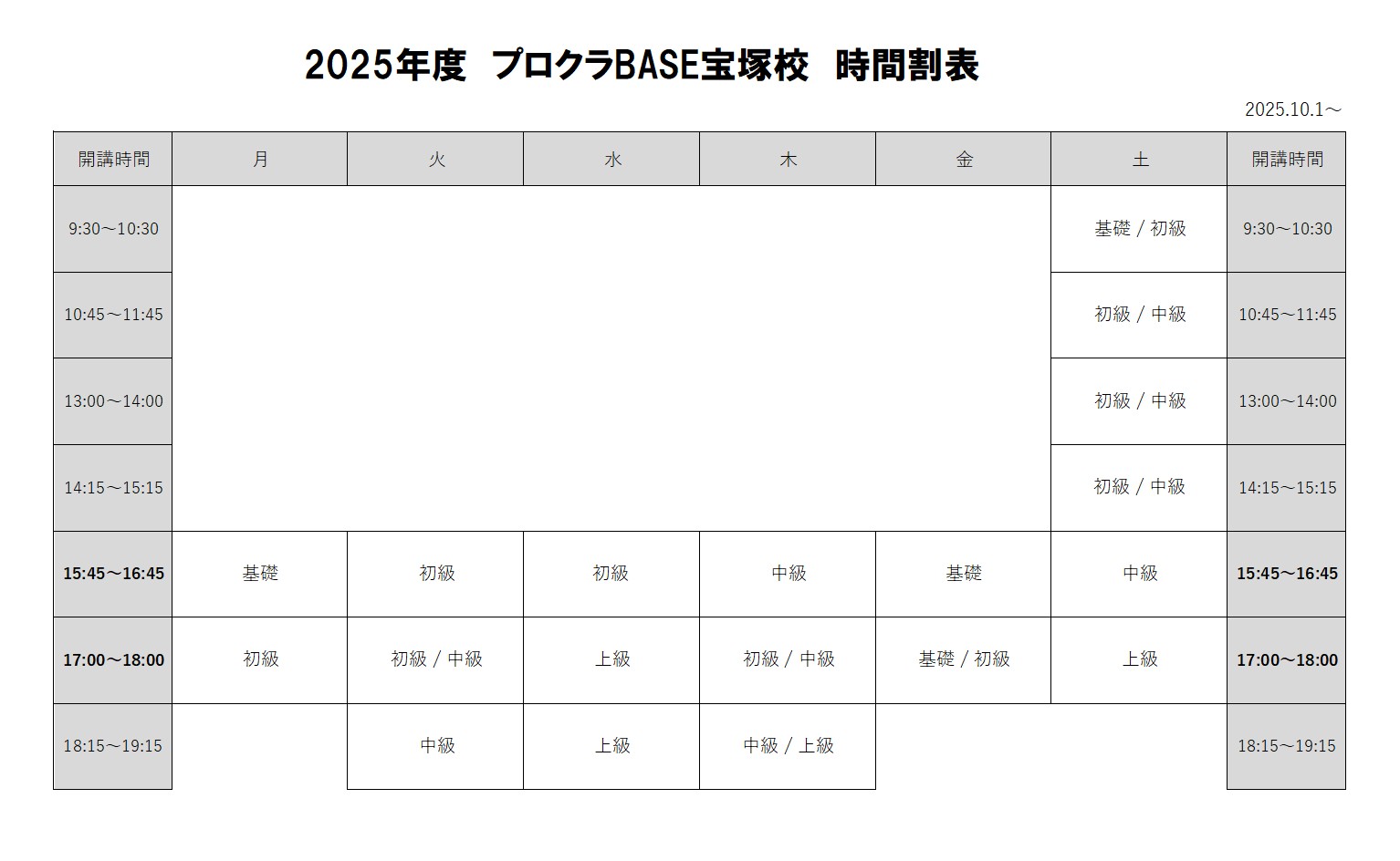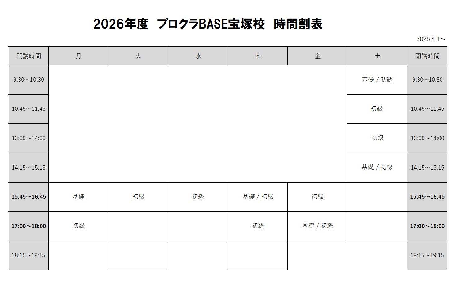 プロクラBASE宝塚校は、月〜土曜日まで毎日開講していますので、受講中の同じコース(基礎・初級)の枠でお振替可能です。